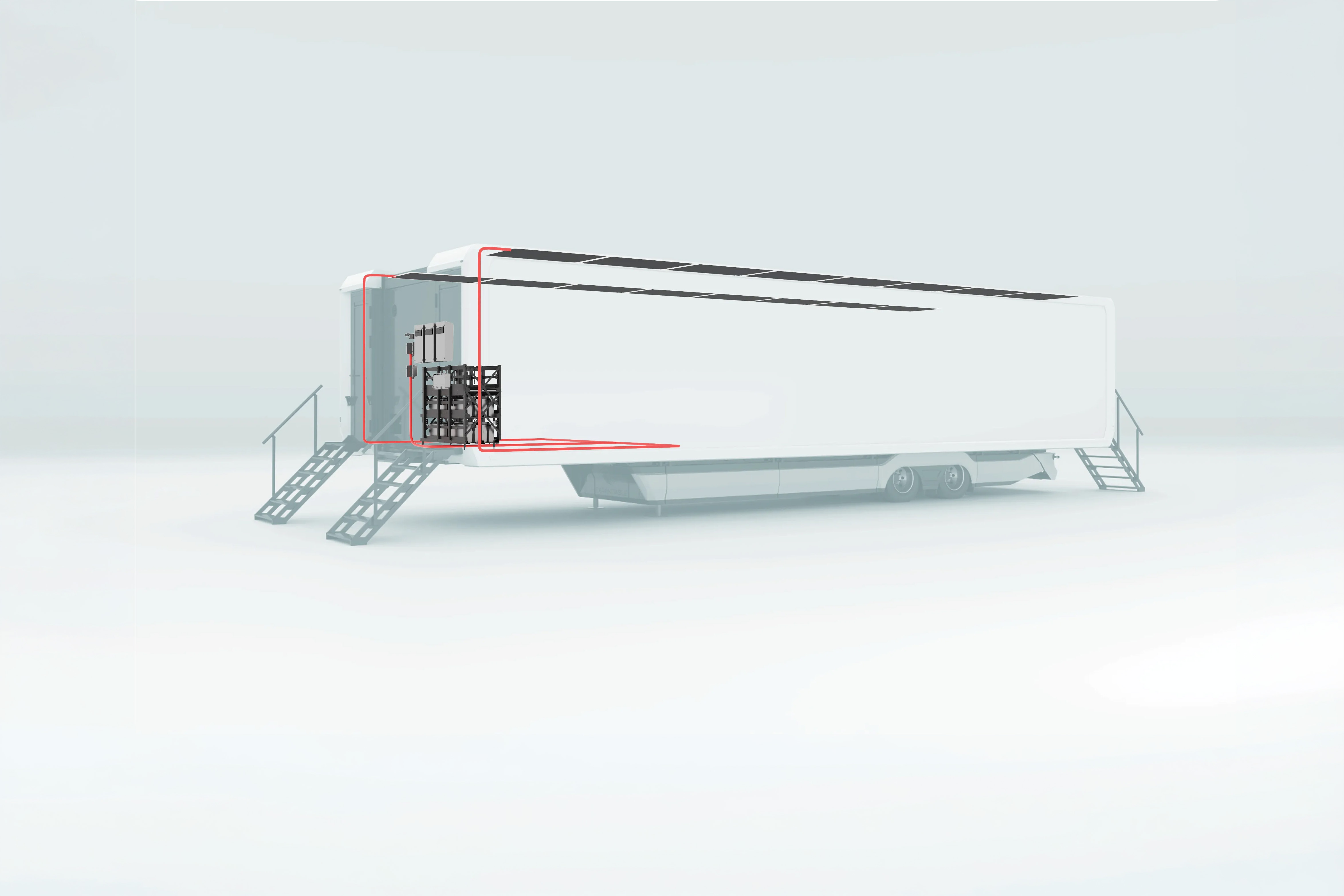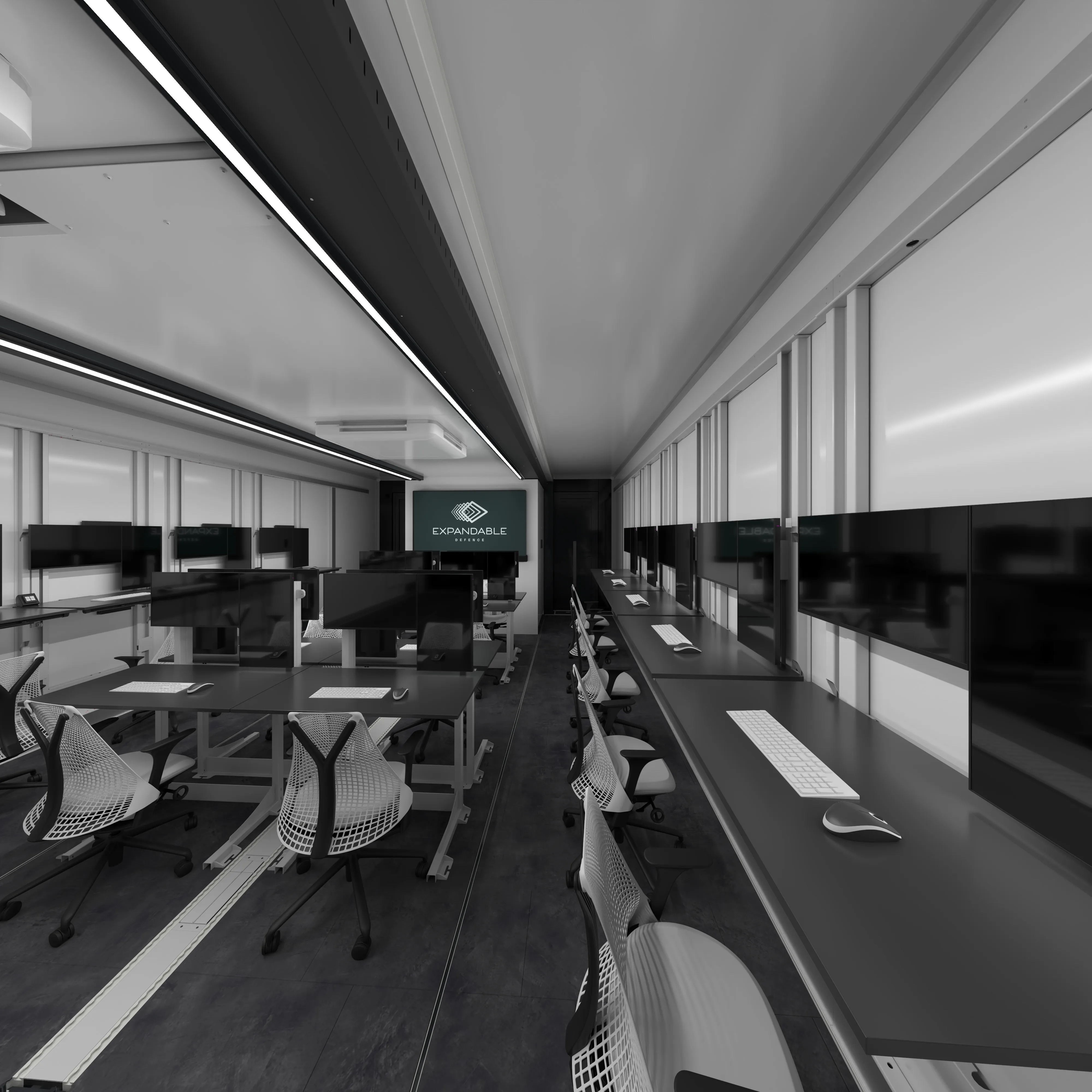 The Expandable Trailer is engineered around a modular architecture that supports rapid reconfiguration at both layout and system level. Integrated stainless-steel cabling channels run along the interior side walls, accommodating power distribution and fibre-optic networks.